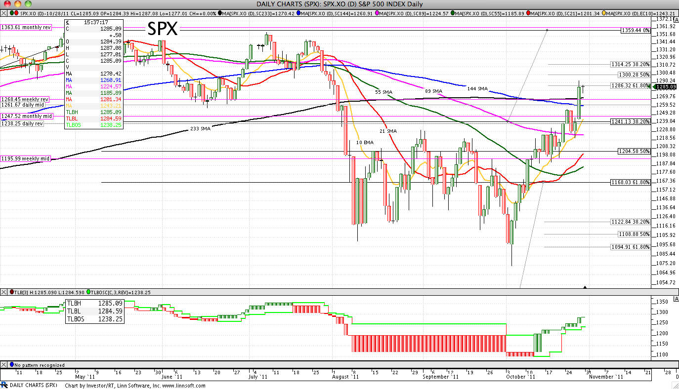 SPXSpinning top day (evening star forming?). Midpoint above EMA(10). Held SMA(144). Tested and failed the 61.8% minor retrace (1286.32). New high on daily 3LB (reversal is 1238.25). QE2infinity. Had a weekly reversal up.