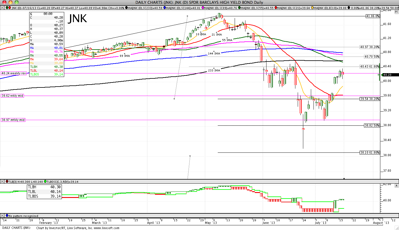 Spinning top day (bearish harami?). Midpoint above EMA(10). Holding above SMA(21). Holding above its 38.2% retrace (39.54). No daily 3LB changes (reversal is 39.14).
